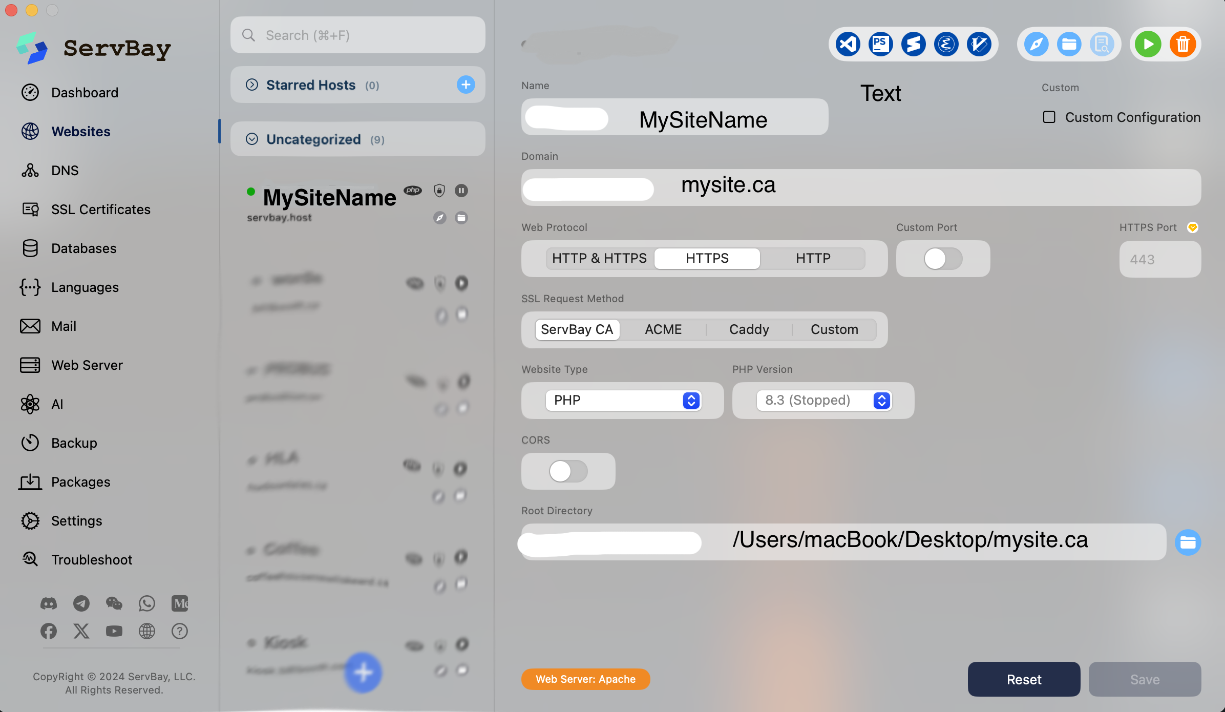 Next step is to integrate with a database such as Sitelok. On the far left panel, I used MySQL and MySQL 8.4 setup. No changes required. User is root and Password is ServBay.dev These are the defaults.
